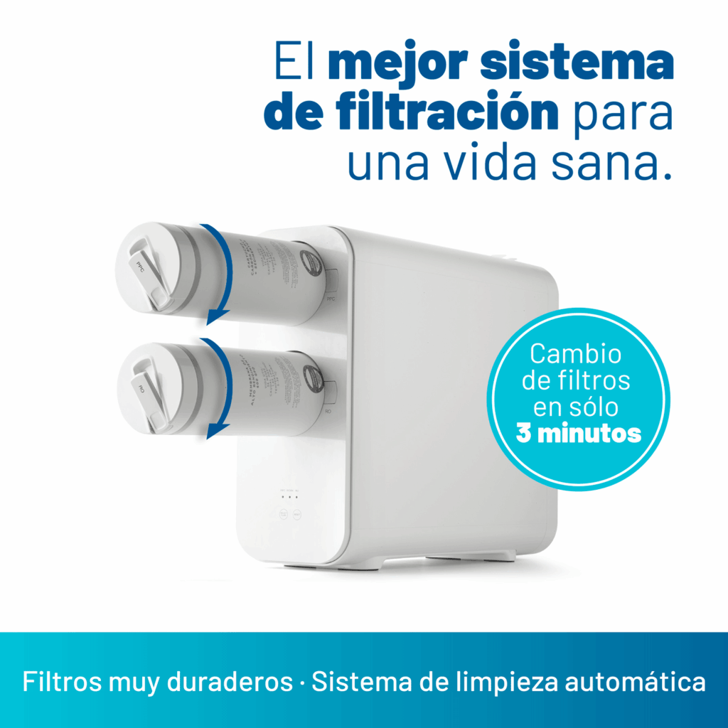 No te preocupes. Los filtros duran 1 año y las membranas duran 3 años. Cambiarlos es tan sencillo que no necesitas ayuda profesional. Más comodidad y menos gastos.
