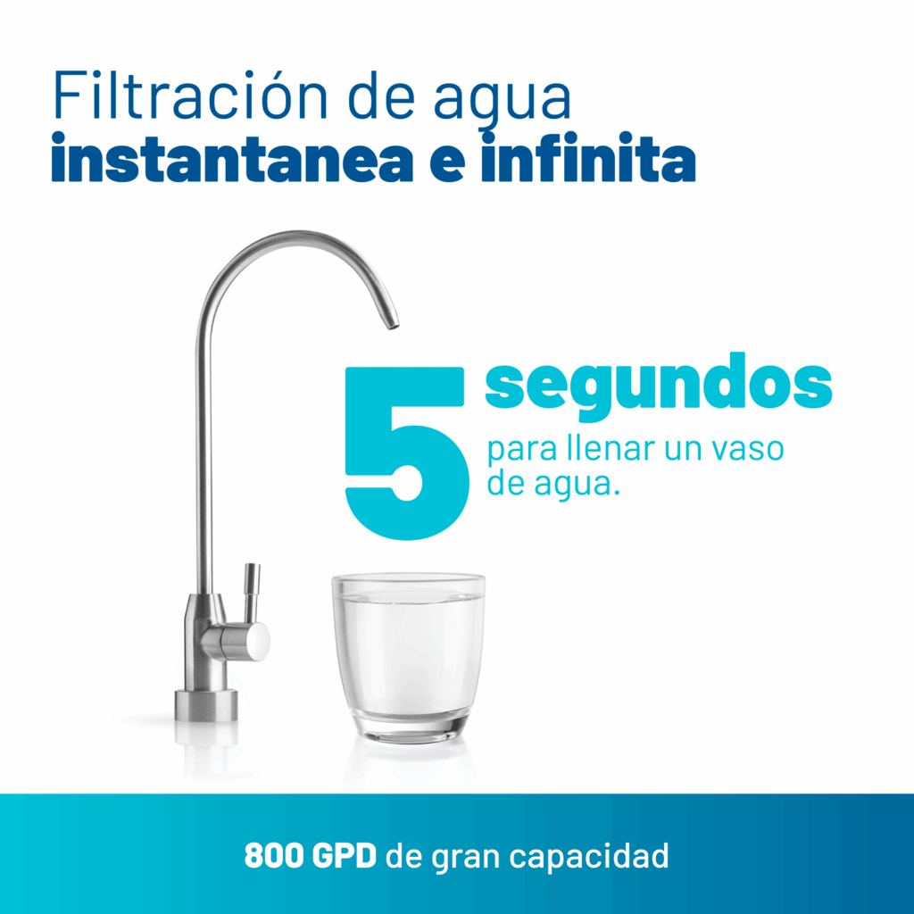 Membrana de bajo rechazo de 800GPD para un flujo de agua constante e ilimitado para toda la familia, sin esperas.